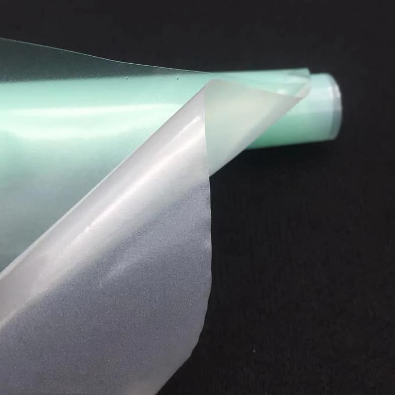 產(chǎn)品形態(tài):薄膜+PE,表面為霧面,熱貼合后呈透明的狀態(tài)。